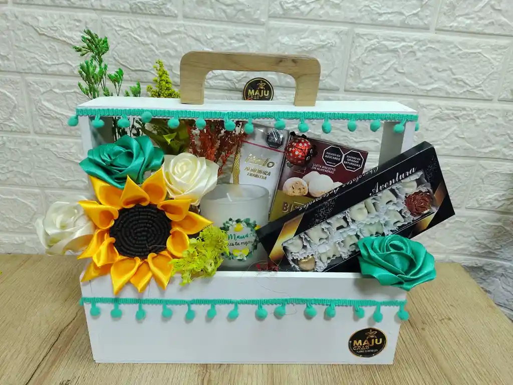 Dia de la madre especial, un detalle que adorara incluye Caja fina en maletin 1 chocolate en letras con mensaje 1 vela en recipiente de vidrio aromatizada 1 galletas finas biscotto 1 caja de almendras 1 arreglo de flores técnica eterna y follaje artificial, girasol y rosas. mensaje dedicatoria