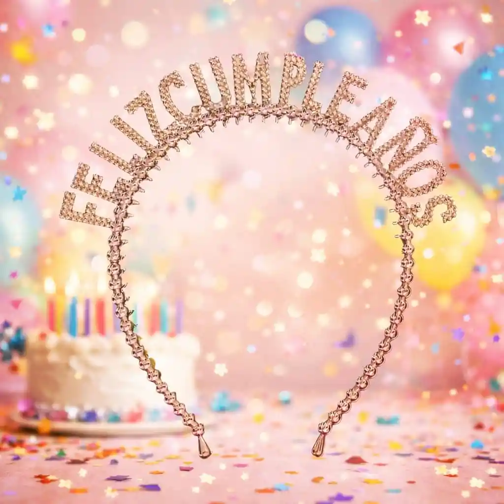 Diadema decorativa con texto “Feliz Cumpleaños” en acabado brillante tono Oro Rosa, ideal para celebraciones, sesiones de fotos y fiestas temáticas. Su diseño elegante con efecto cristal aporta un look llamativo y festivo para la persona homenajeada. •Acabado brillante tipo joyería •Ideal para cumpleaños y fotos •Ligera y cómoda de usar •Perfecta como accesorio protagonista Excelente complemento para decoración de fiesta Incluye: 1 diadema “Feliz Cumpleaños”. Los elementos de ambientación en las imágenes no están incluidos.