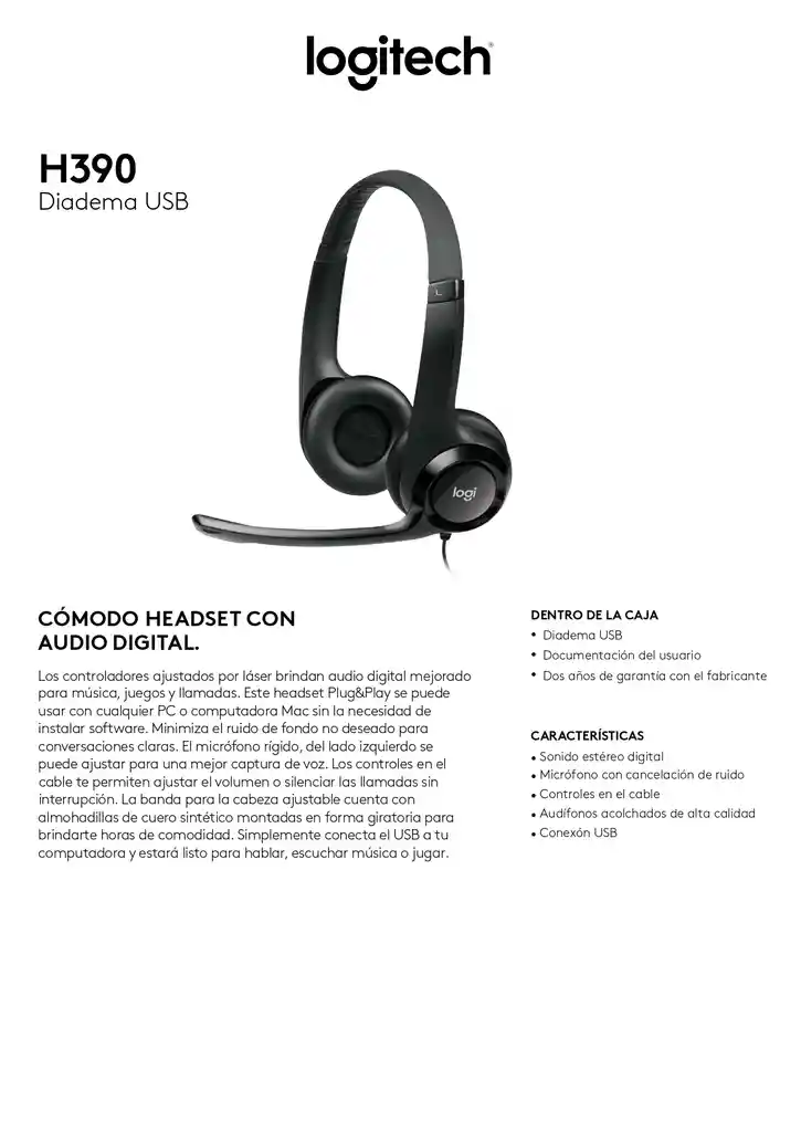 El Logitech H390 es un auricular ideal para llamadas por Internet nítidas con una simple conexión USB Plug and Play y un micrófono con supresión de ruido. Los controles integrados en el cable permiten controlar el volumen o silenciarlo sin interrumpir la llamada.