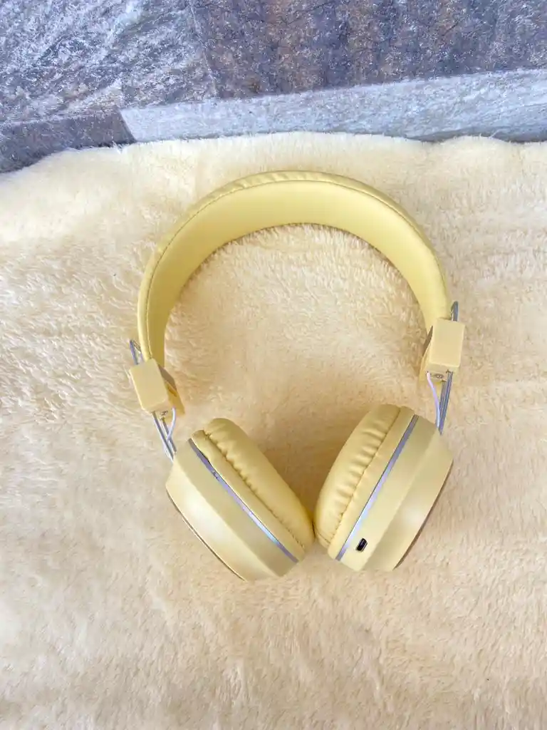 1. Diseño: Audífonos tipo diadema con almohadillas acolchadas para mayor comodidad. 2. Color: Amarillo claro (pálido) con detalles plateados en las barras y el borde de los auriculares. 3. Decoración: En el exterior de uno de los auriculares hay un diseño de un león de dibujos animados con una melena amarilla y detalles dorados, rodeado de estrellas y círculos pequeños. 4. Material: El exterior parece ser de plástico, mientras que las almohadillas son de un material suave, posiblemente cuero sintético o tela acolchada. 5. Uso: Parecen diseñados para niños, dado el diseño infantil del león y los colores suaves.