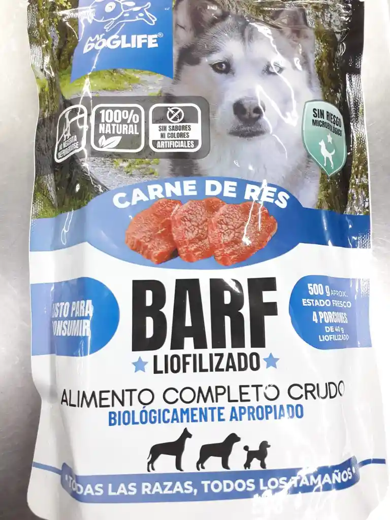 Alimento completo liofilizado BARF de carne de res Es un alimento completo y balanceado. Desarrollado con la más alta y novedosa tecnología pensando siempre en el bienestar de tu mascota. Contenido: 140g liofilizados equivalente a 500g de producto fresco. Ventajas del producto liofilizado: Control total de microorganismos patógenos. El proceso de liofilización elimina cualquier riesgo microbiológico asociado a la manipulación de comida cruda. No necesita refrigerar ni congelar. No se rompe la cadena de frío y, por lo tanto, no hay riesgo de multiplicación bacteriana. No varía su carga nutricional ni organoléptica. Al no tener que combinarlo con alimentos en su nevera, no habrá contaminación cruzada. Ideal para transportar en paseos o viajes sin necesidad de cavas o refrigeración. Apto para todas las razas y todas las edades a partir de los 2 meses de edad.