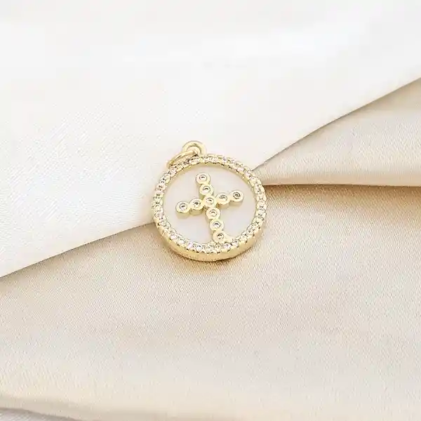 Dije Círculo Blanco con Cruz y Circones en rodio, símbolo de fe y elegancia con brillo sutil.