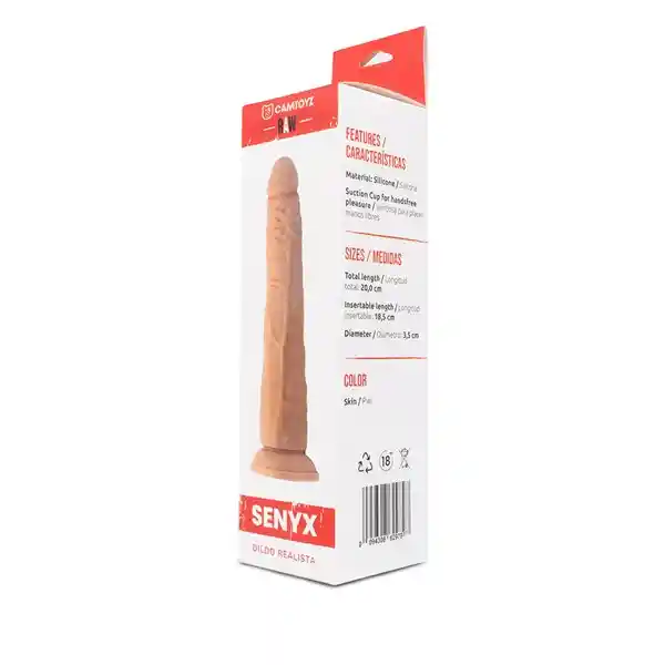 Dildo Realista con ventosa y suave textura De alta calidad, flexible y resistente Fabricado con silicona segura para el cuerpo, el Dildo Realista Senyx es un juguete cómodo, suave, y de estructura perfecta gracias a su posibilidad de usarse manejándose con las manos o de forma libre y en muchos lugares, ya que cuenta con ventosa. GARANTÍA 1 año GÉNERO Unisex INTERACTIVO O CON APP No LIMPIEZA Antes de usar el juguete por primera vez, y después de cada uso, este debe ser limpiado para reducir el riesgo de infecciones, mantener la higiene adecuada y evitar el deterioro rápido del juguete.Recomendamos un producto especial para limpieza óptima como los Limpiadores para Juguetes. MARCA CamToyz MATERIAL Silicona suave, segura para el cuerpo, no tóxica MEDIDAS Longitud: 18, 3 cm Longitud insertable: 17, 7 cm Diámetro: 4 cm PESO 205 g PRESENTACIÓN Diseño realista con ventosa para sujeción en superficies lisas RECOMENDACIONES DE USO Para una experiencia más placentera, es ideal que el uso de este juguete sea con lubricantes a base de agua. Recomendamos el Gel Lubricante Íntimo Natural Elixir.No se deben usar lubricantes de silicona con juguetes de silicona. Podrían sufrir daños irreversibles. RESISTENTE AL AGUA 100% impermeable Dildo Realista Senyx 19 cm Cuidados: No debe usarse con lubricantes de silicona, ya que podría sufrir daños irreversibles Limpieza: Antes de usar el juguete por primera vez, y después de cada uso, este debe ser limpiado para reducir el riesgo de infecciones, mantener la higiene adecuada y evitar el daño rápido del juguete. Confidencialidad: Tus pedidos serán enviados en una caja o sobre totalmente sellado, opaco sin ningún tipo de marcas. para nosotros es muy importante tu privacidad. Despacho a todo Colombia