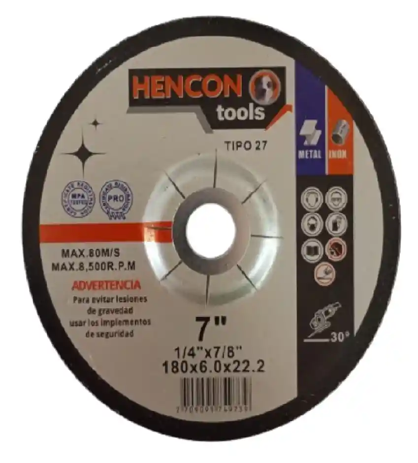 DISCO DE PULIR HENCON 7" x 1/4" x 7/8" El Disco de Pulir HENCON está diseñado para trabajos de desbaste, pulido y preparación de superficies metálicas, ofreciendo alto rendimiento y larga durabilidad. Fabricado con abrasivos de alta calidad, garantiza excelente resistencia al desgaste y estabilidad durante el trabajo. Es ideal para aplicaciones en acero, hierro y metales ferrosos, permitiendo remover material de manera eficiente y controlada. Compatible con amoladoras angulares de 7 pulgadas, es una herramienta confiable para uso profesional e industrial. Especificaciones Técnicas Diámetro: 7" (180 mm) Espesor: 1/4" (6 mm) Orificio central: 7/8" (22.23 mm) Material: Abrasivo de alto rendimiento Aplicación: Desbaste, pulido y acabado de metales Compatibilidad: Amoladoras angulares estándar de 7" Dimensiones del producto Largo: 180 mm Ancho: 180 mm Alto (espesor): 6 mm Peso 358 gramos Ventajas ✔ Alta resistencia y durabilidad ✔ Excelente rendimiento en desbaste ✔ Mayor estabilidad durante el uso ✔ Ideal para uso profesional e industrial