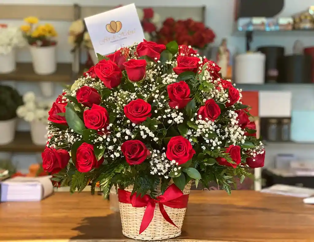 Exprese sus sentimientos con un hermoso diseño floral frutal elaborado por Flor de Helena, con rosas frescas, gypsophilia, rusco, helecho cuero, en un canasto especial para flores artesanal.