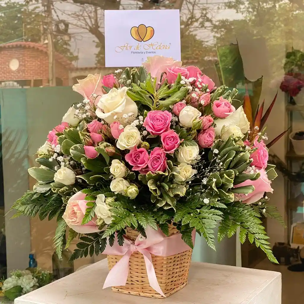 Exprese sus sentimientos con un hermoso diseño floral frutal elaborado por Flor de Helena, con rosas frescas, mini rosas, gypsophilia, fitusesporium, helecho cuero, en un canasto especial para flores artesanal.
