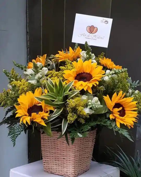 Exprese sus sentimientos con un hermoso diseño floral frutal elaborado por Flor de Helena, con girasoles frescos, canción de la india, solidago amarillo, snack dragón, helecho cuero, en un canasto especial para flores artesanal.