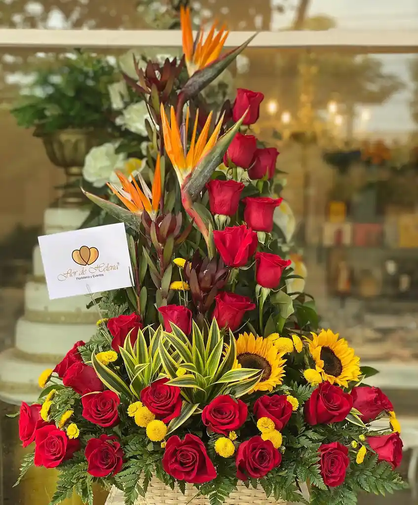 Exprese sus sentimientos con un hermoso diseño floral elaborado por Flor de Helena, con rosas frescas, ave de paraíso, proteas, canción de la india, helecho cuero, canción de la india, pinopios, en un canasto especial para flores artesanal. Incluye Tarjeta.
