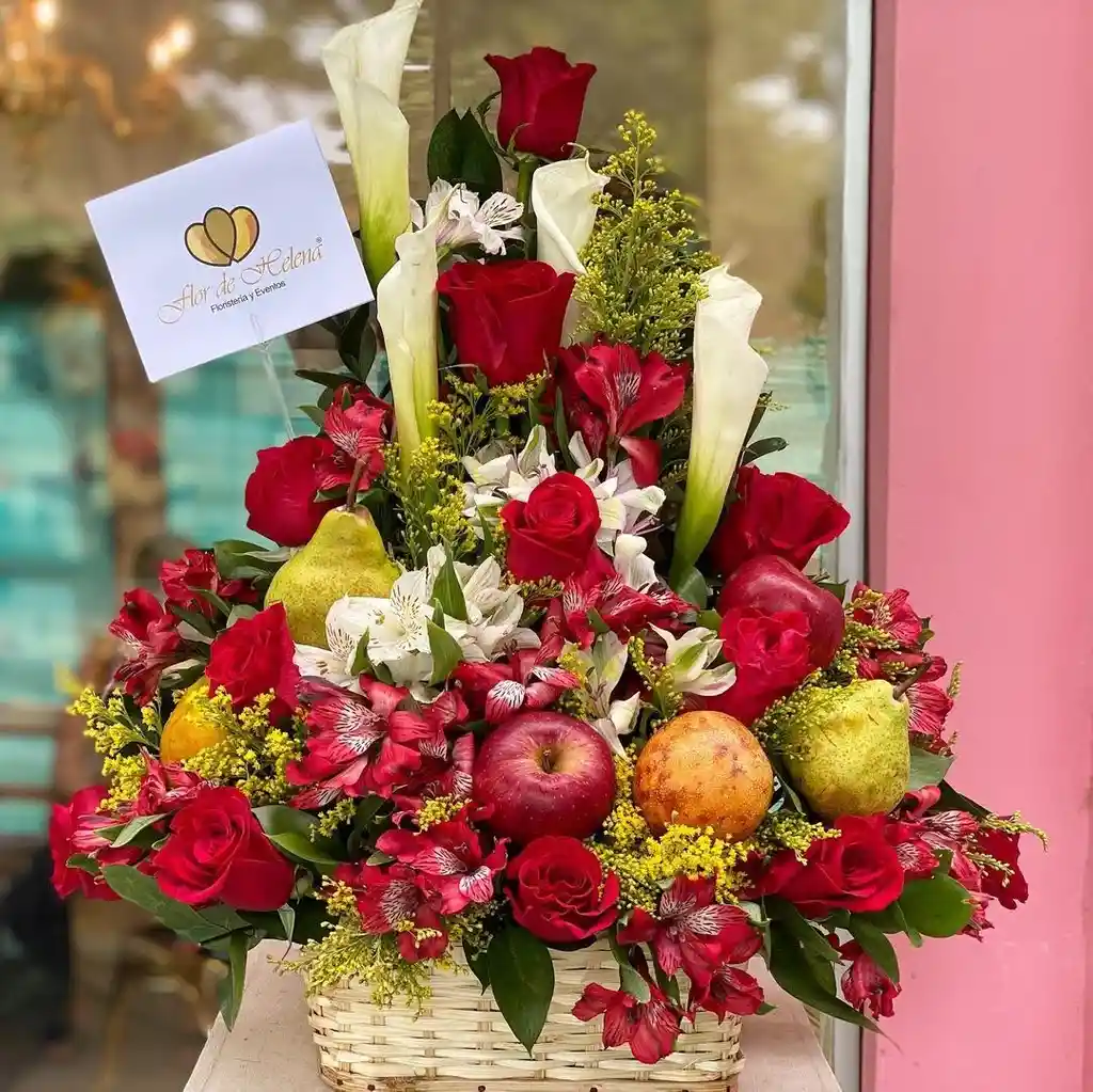 Exprese sus sentimientos con un hermoso diseño floral frutal elaborado por Flor de Helena, con rosas frescas, cartuchos, astromelias, solidago amarillo, helecho cuero, manzanas, peras, mandarinas, granadillas, en un canasto especial para flores artesanal.