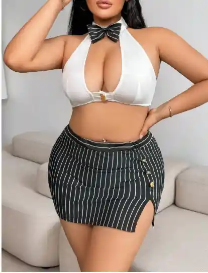 ¡Directora de Pasiones! 👠 Disfraz de Oficinista Ejecutiva Atrevida. Rompe con la monotonía de la oficina y transforma tus noches con nuestro irresistible disfraz de oficinista. Este conjunto fusiona la autoridad profesional con un toque audaz y seductor, ¡perfecto para tomar el control! El top blanco tipo halter con un escote que desafía los códigos de vestimenta de la oficina y detalles de botones dorados, te hará sentir poderosa. La mini falda de rayas diplomáticas con una abertura lateral y botones decorativos añade un toque chic y juguetón. La pajarita negra completa el look, aportando ese aire de distinción que no pasa desapercibido. ¡Ideal para fiestas de disfraces, noches de rol o para añadir un toque "ejecutivo" a tus momentos especiales! Incluye: Top halter, mini falda de rayas diplomáticas y pajarita. Material: Tejido elástico y cómodo. Talla: M,L y XL