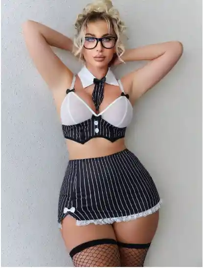 ¡Horas extras con estilo! 👩💼 Disfraz de Secretaria Ejecutiva Atrevida. Rompe con la rutina de la oficina y transforma tu noche con nuestro irresistible disfraz de secretaria. Este conjunto combina la seriedad profesional con un toque seductor y juguetón, perfecto para captar todas las miradas. El top estilo bustier con copas transparentes y un diseño de rayas diplomáticas es el centro de atención, evocando un chaleco de oficina pero con un giro atrevido. La mini falda a juego, también de rayas diplomáticas y con un delicado borde de encaje, te hará sentir poderosa y femenina. Completa el look con el cuello blanco de camisa y la corbata a juego, añadiendo ese toque de autoridad irresistible. ¡Ideal para fiestas de disfraces, noches de rol o para darle un "ascenso" a tus noches especiales! Incluye: Top tipo bustier, mini falda, medias tipo malla, cuello de camisa y corbata. Material: Tejido elástico y cómodo. Talla: M y L
