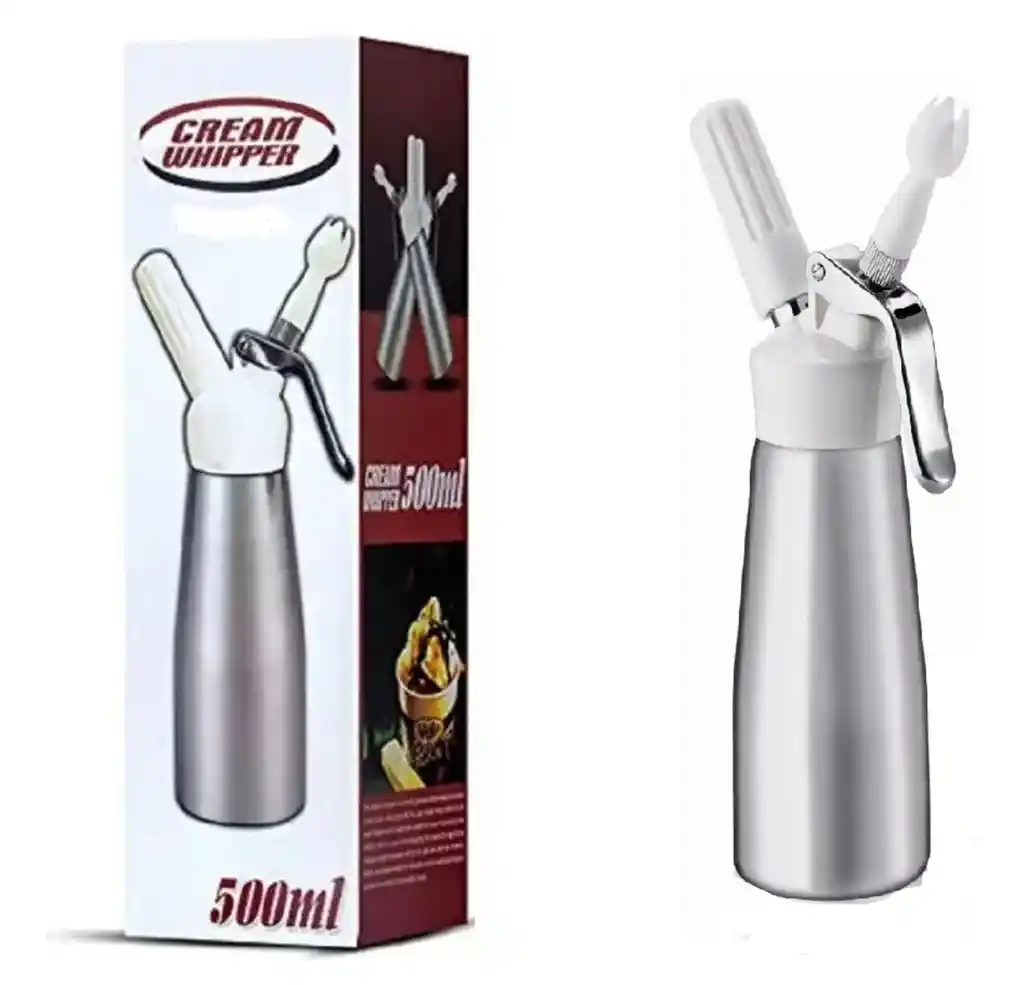 Dispensador De Crema Chantilly De 500ml Especificaciones: - Cuerpo de la botella en acero - Para el uso profesional. - Válvula dosificadora fija, para una dosificación más fácil incluso en aplicaciones en caliente. Producto: Este es un dispensador para preparacion de crema chantilly Para la preparación de espumas ligeras y esponjosas, bocaditos, salsas calientes y frías, sopas cremosas, así como nata montada y postres. Para preparaciones frías y calientes .Cuerpo de la botella desarrollado para el uso profesional. Incluye: - Botella - Boquillas churrasco y cabezal. - caja x 12 capsulas Tamaño: Alto 26cm Ancho 7cm