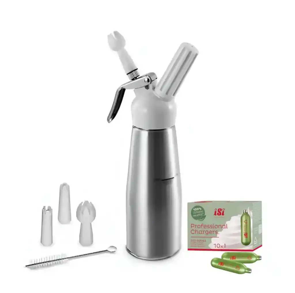 Dispensador De Crema Chantilly De 500ml Especificaciones: - Cuerpo de la botella en acero - Para el uso profesional. - Válvula dosificadora fija, para una dosificación más fácil incluso en aplicaciones en caliente. Producto: Este es un dispensador para preparacion de crema chantilly Para la preparación de espumas ligeras y esponjosas, bocaditos, salsas calientes y frías, sopas cremosas, así como nata montada y postres. Para preparaciones frías y calientes .Cuerpo de la botella desarrollado para el uso profesional. Incluye: - Botella - Boquillas churrasco y cabezal. - caja x 10 capsulas isi Tamaño: Alto 26cm Ancho 7cm