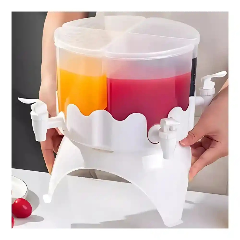 4 termos de 1 Litro cada uno Material: Está fabricado en plástico (polipropileno seguro). Diseño: Cuenta con un diseño giratorio de 360 grados que permite un fácil acceso a las bebidas. Capacidad: Tiene una gran capacidad, de hasta 4 litros. Compartimentos: incluye 4 compartimentos o rejillas separadas, lo que permite almacenar diferentes tipos de bebidas simultáneamente. Practicidad: Diseño compacto y estrecho, ideal para colocar en el refrigerador sin ocupar mucho espacio. Tapa grande y cubierta de gran diámetro para facilitar la adición de agua u otros ingredientes. Grifo integrado para servir sin esfuerzo y sin fugas. Desmontable para una limpieza sencilla. Uso: Ideal para una amplia gama de bebidas caseras como limonada, leche de soja, batidos, cócteles y yogures. Dimensiones : 14 x 14,5 x 26,5 cm.