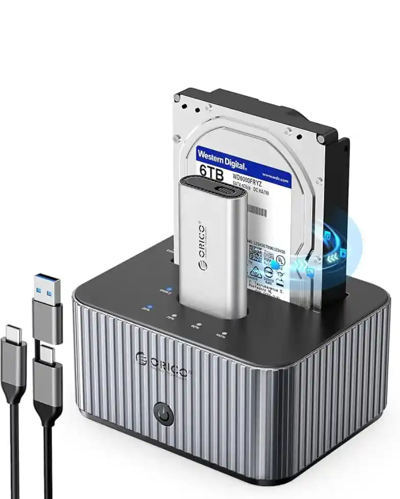 • NVMe & Dock SATA 2.5''/3.5'': Soporta lectura/escritura simultánea de SSD SATA 2.5''/3.5'' y PCIe NVMe; admite hasta 8 TB de SSD M.2 PCIe NVMe y 22 TB de SSD/HDD SATA; Plug and play, no es necesario instalar controladores adicionales • Clonación sin conexión: La estación de acoplamiento SSD/HDD facilita la clonación de HDD/SSD 2.5''/3.5'' a SSD M.2 PCIe NVMe o de SSD M.2 PCIe NVMe a HDD/SSD 2.5''/3.5''; los discos de origen y destino se pueden personalizar con un botón de conmutación • Transmisión de alta velocidad: Con USB 3.2 Gen 2, experimentará una transferencia de datos no solo rápida, sino también impresionantemente eficiente, con SSD NVMe que ofrecen velocidades de transferencia de hasta 10 Gbps; la velocidad máxima de transferencia del disco duro SATA de 2,5/3,5 pulgadas es de 5 Gbps • Caja de disipación de calor innovadora: El dock NVMe ORICO utiliza una carcasa de M.2 aluminio para controlar el calor y proteger el SSD. Reduce el desgaste de los contactos dorados del SSD, mientras ofrece una experiencia de manejo más fresca y cómoda • Conectividad universal: Compatible con sistemas Windows, macOS y Linux; el dock HDD viene con un cable Type-C 2-en-1 versátil que permite la conexión a laptops, desktops, televisores y más; una solución flexible para necesidades de almacenamiento y copia de seguridad en varios dispositivos