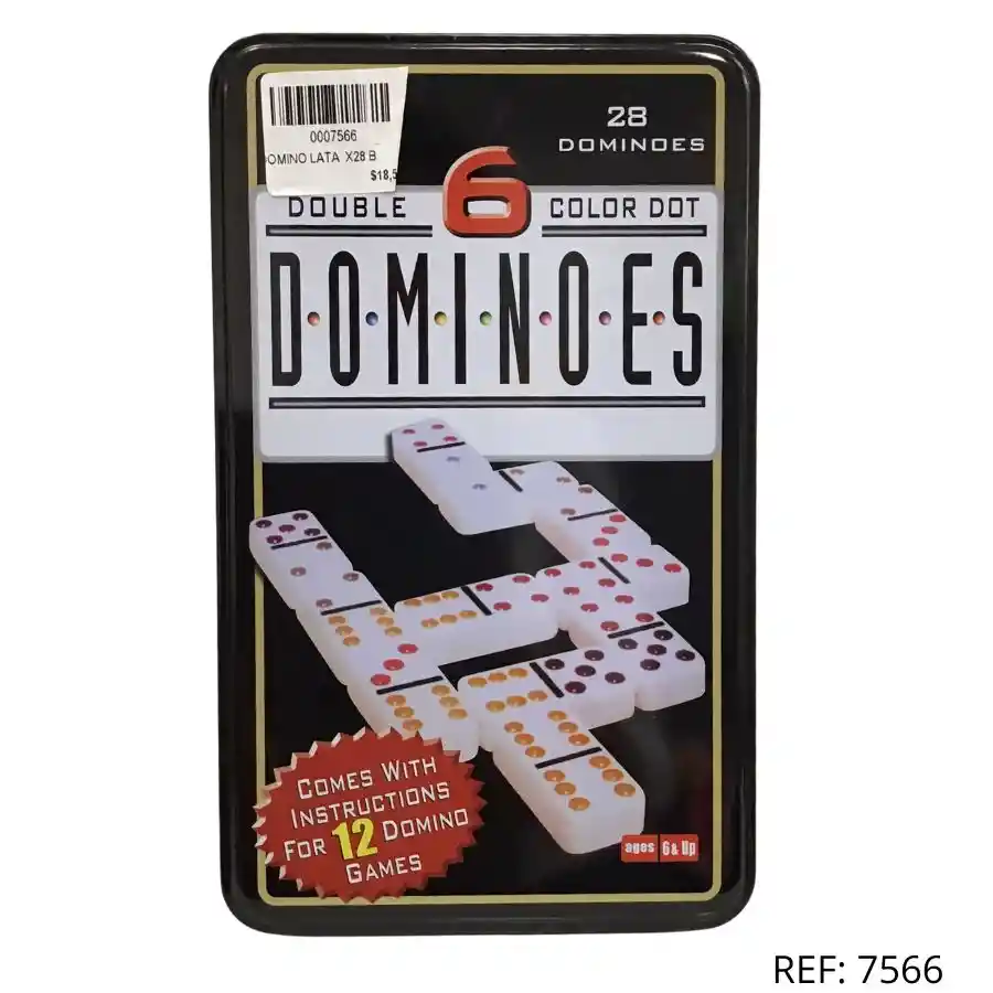 Domino doble 6 en lata con puntos de colores. ¡Incluye instrucciones para 12 juegos diferentes!