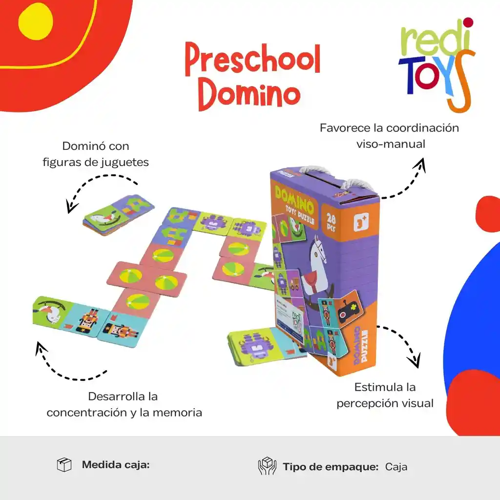 Dominó con figuras de juguetes, ayuda a desarrollar habilidades cognitivas, como la concentración, la memoria y la percepción visual. También ayuda a desarrollar habilidades psicomotoras, como la coordinación viso-manual.