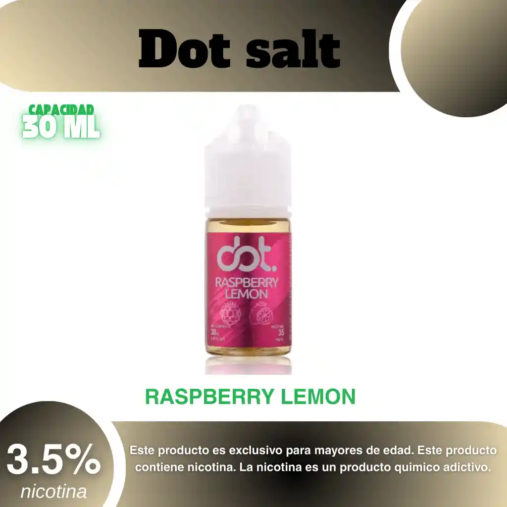Dot Salt Sabor Limonada de Frambuesa 35% PROHIBIDA LA VENTA A MENORES DE EDAD. ADVERTENCIA: ESTE PRODUCTO CONTIENE NICOTINA, LA NICOTINA ES UNA SUSTANCIA QUIMICA ADICTIVA Y NOCIVA PARA LA SALUD. Los líquidos para vapeo contienen: propilenglicol USP, glicerina USP, sabor artificial y nicotina. Este producto puede contener nicotina, una sustancia altamente adictiva que puede generar dependencia, posibles afectaciones arteriales, cardiacas, pulmonares y otras aun no identificadas. No se recomienda su uso a mujeres en embarazo, puede generar lesiones al feto. Mantener alejado de niños y mascotas. No ingerir, puede generar irritación y/o intoxicación. Por favor antes de consumir consulte a su médico posibles afectaciones o sensibilidad a alguno de sus componentes. Los componentes de este producto pueden aumentar la sensación de ansiedad En caso de notar alguna reacción adversa por favor suspenda su uso de manera inmediata. Siga las instrucciones en el envase. No alterar sus componentes. Adquiera sus productos en sitios de confianza No use productos piratas, alterados, o en los cuales no pueda comprobar su buena procedencia, Verifique la reputación del fabricante y distribuidor antes de adquirir cualquier producto Si no es usuario fumador o vapeador no se recomienda su uso bajo ninguna circunstancia Al usar este producto usted es consciente que este producto puede generar afectaciones a su salud, incluyendo aquellas que a la fecha de la compra no se han identificado y que pueden aparecer a largo plazo
