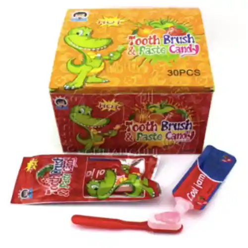 Dulce en forma de cepillo de dientes con sabor artificial a manzana verde, naranja o fresa con crema sabor artificial a fresa