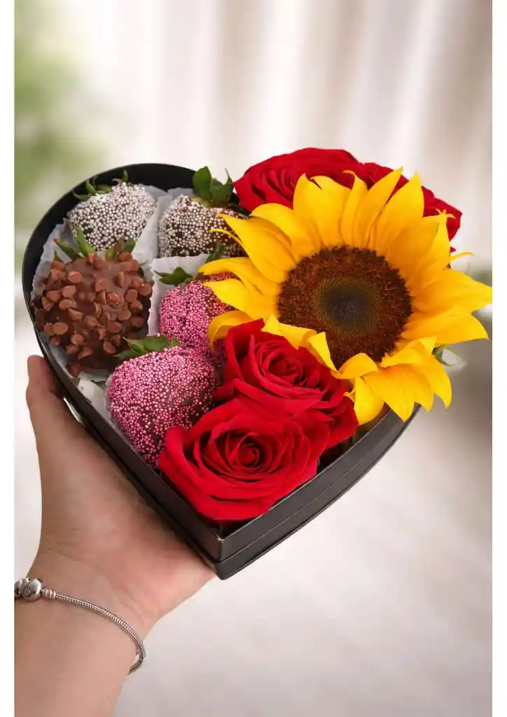 Caja corazón contiene 5 fresas cubiertas en chocolate,con topings de elección 1 girasol y 4 rosas.