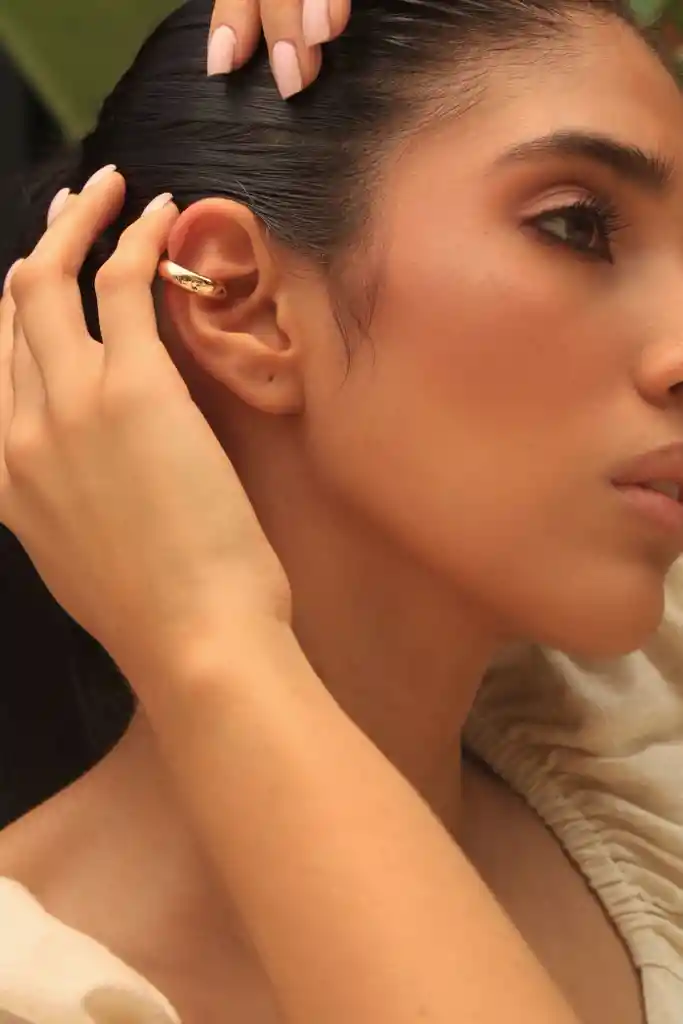 Ear cuff dorado en material rodio, de diseño liso y minimalista, con brillo elegante y ajuste cómodo sin perforación.