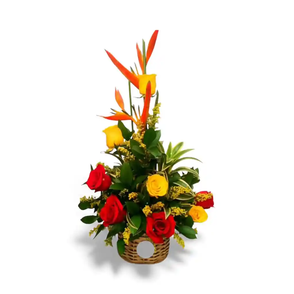Arreglo elaborado en una base de madera con rosas , canción , aves de paraíso , rusco y soliaster