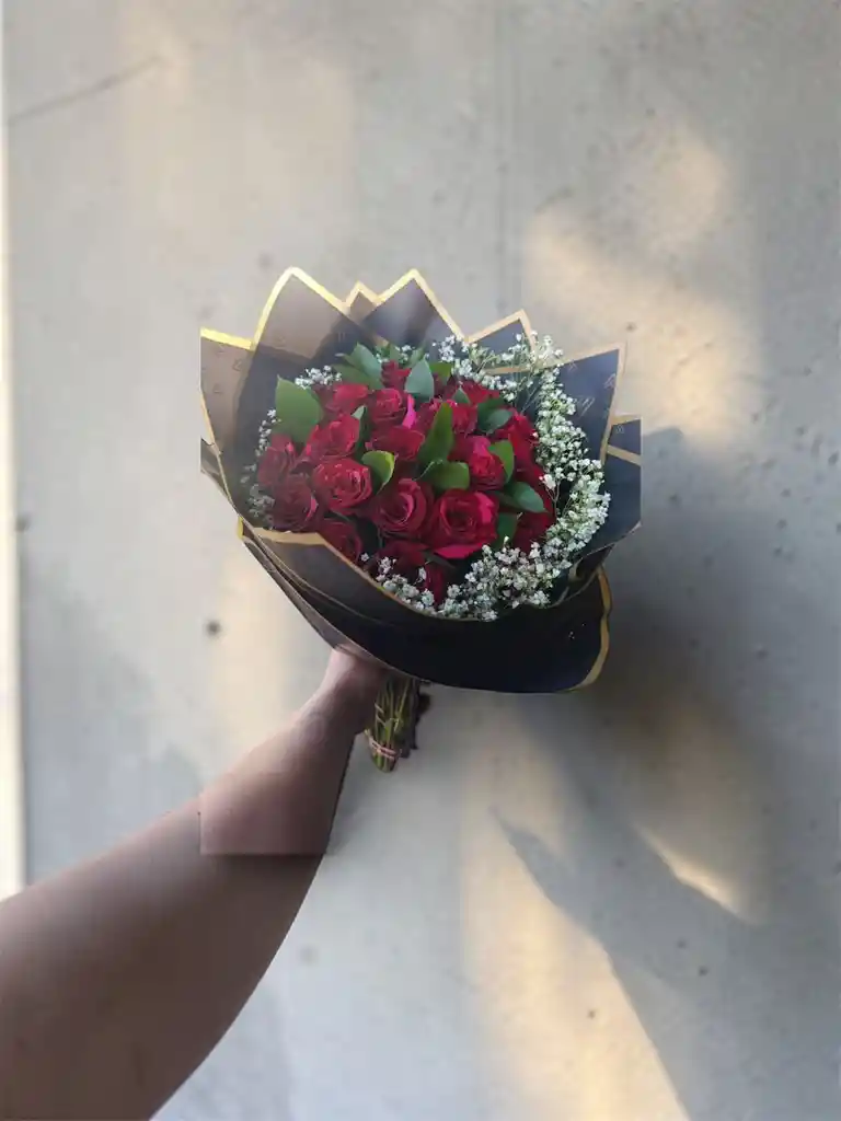 🌹🌹Expresa tus sentimientos con la perfección de lo clásico. Este bouquet de Loren's Floristería es una pieza equilibrada y sofisticada, diseñada para quienes aprecian la belleza en los detalles minuciosos y los acabados de lujo. La armonía de este diseño se basa en: El Corazón: Un conjunto de 24 Rosas Rojas seleccionadas por su apertura y color vibrante, agrupadas con precisión artesanal. Contraste Natural: El follaje de Rusco verde intenso se entrelaza entre las rosas, aportando frescura y resaltando el rojo aterciopelado de los pétalos. Marco de Luz: Un delicado borde de Perla (Gypsofila) rodea el conjunto, creando un halo blanco que ilumina todo el bouquet. Sello de Distinción: Envuelto cuidadosamente en Papel Coreano de tono oscuro con bordes dorados, que le otorga una estructura moderna y una presentación lista para deslumbrar. Es el detalle ideal para aniversarios, celebraciones de mes o simplemente para recordarle a esa persona que es el centro de tu mundo.