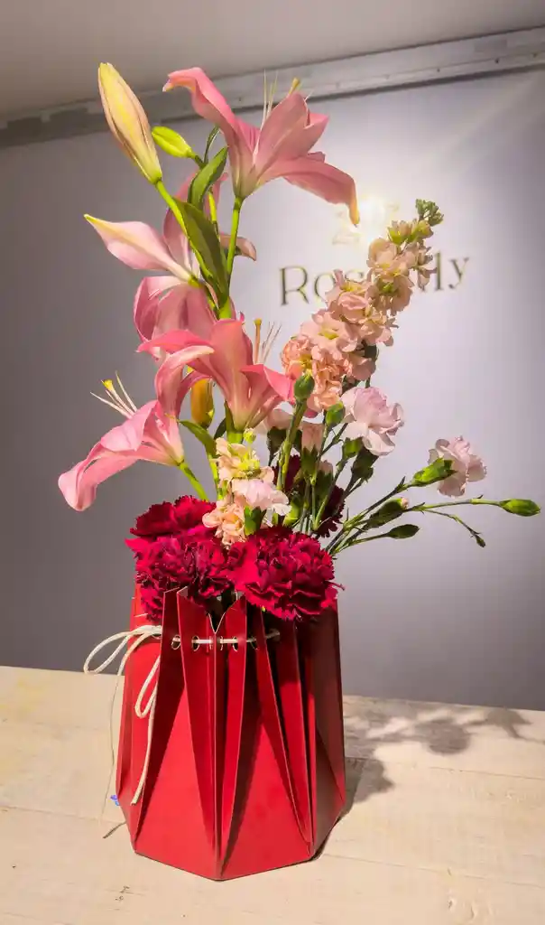 Este diseño es una coreografía de líneas y texturas que celebra la fuerza del carácter y la elegancia clásica. En Roselily, hemos concebido este arreglo en florero como una pieza arquitectónica donde la verticalidad de los lirios se encuentra con la pasión compacta de los claveles. Es un tributo a la nobleza y a la belleza que se alza con orgullo, ideal para transformar cualquier espacio en un escenario de sofisticación.