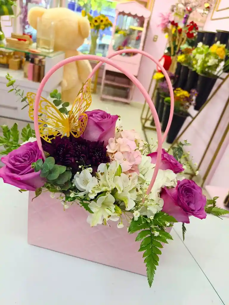 Cartera de rosas rosadas mas claveles, hortensia y follaje