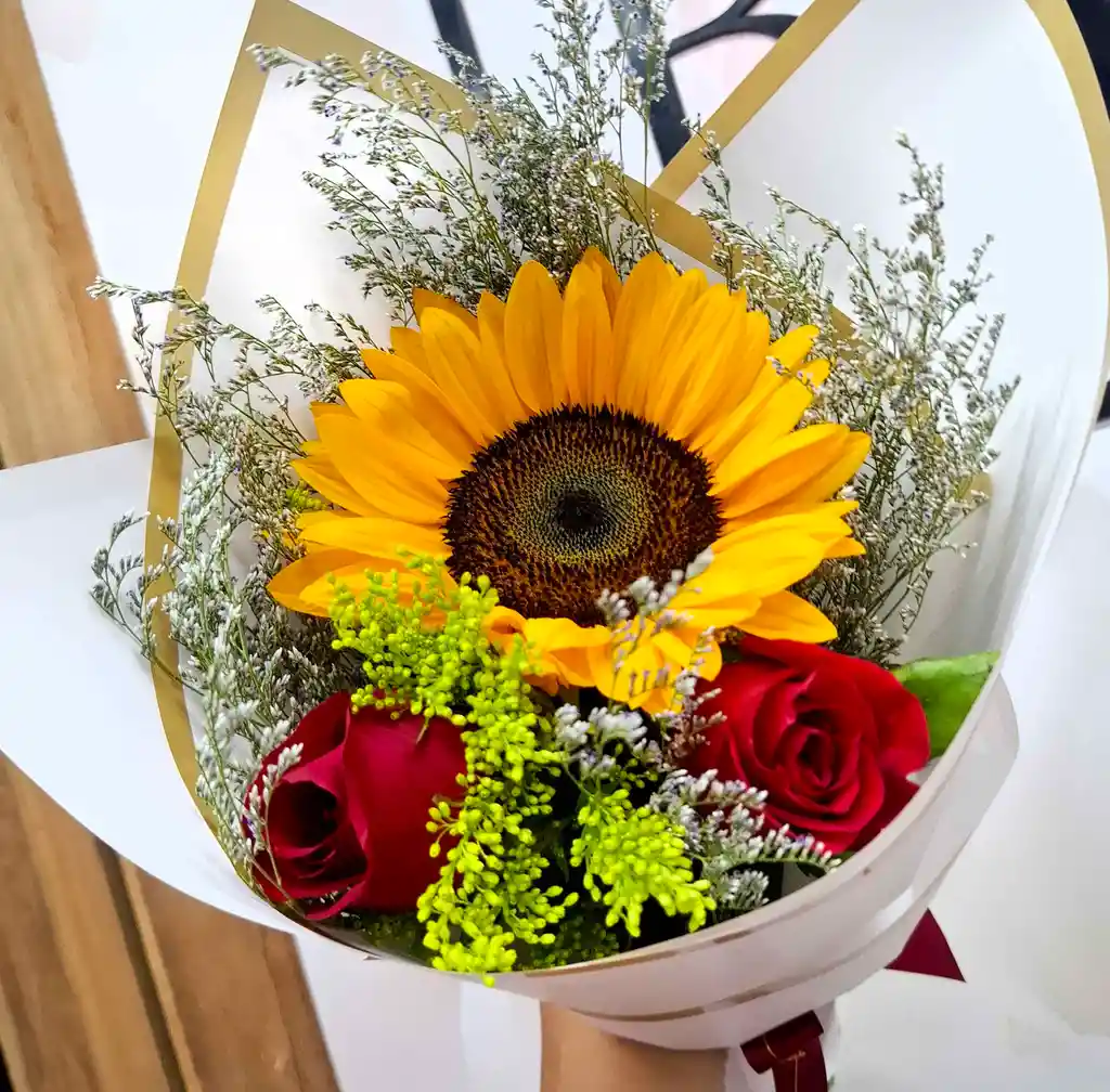 Hermoso Girasol Acompañado de rosas y toque de caspia.