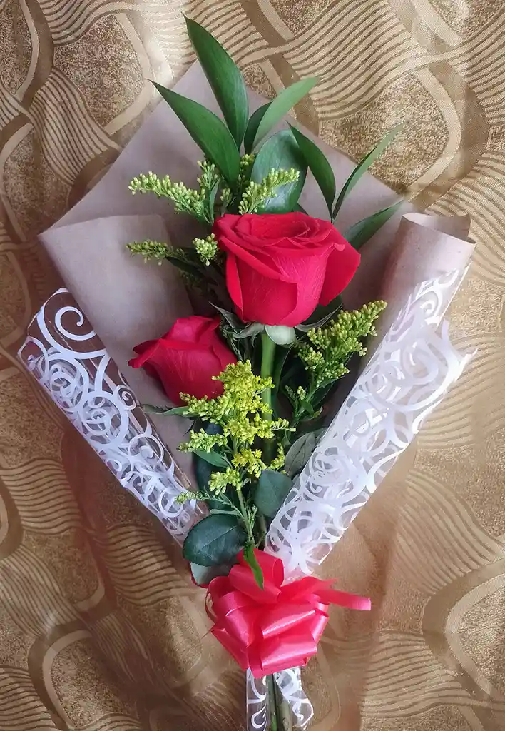 Hermoso bouquet de 2 delicadas rosas rojas 🌹 acompañado con su follaje de solidaster y rusco con envoltura 💖 Tu mejor opción para tu mejor regalo. 😉💕
