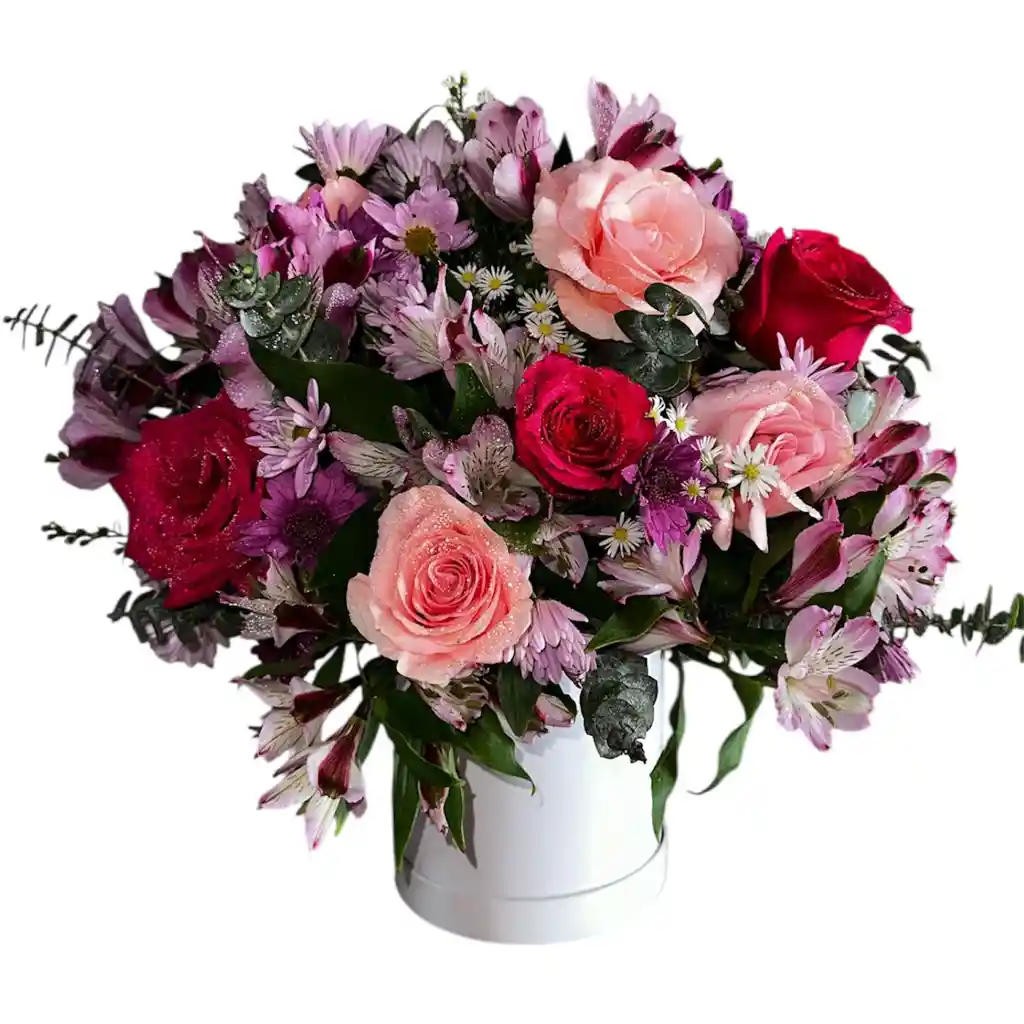 Elegante diseño en base cilíndrica compuesto por rosas surtidas acompañadas de eucalipto, caspia y margaritas, creando una combinación fresca, colorida y armoniosa. Un detalle sofisticado y lleno de vida, ideal para celebrar momentos especiales con estilo y delicadeza.