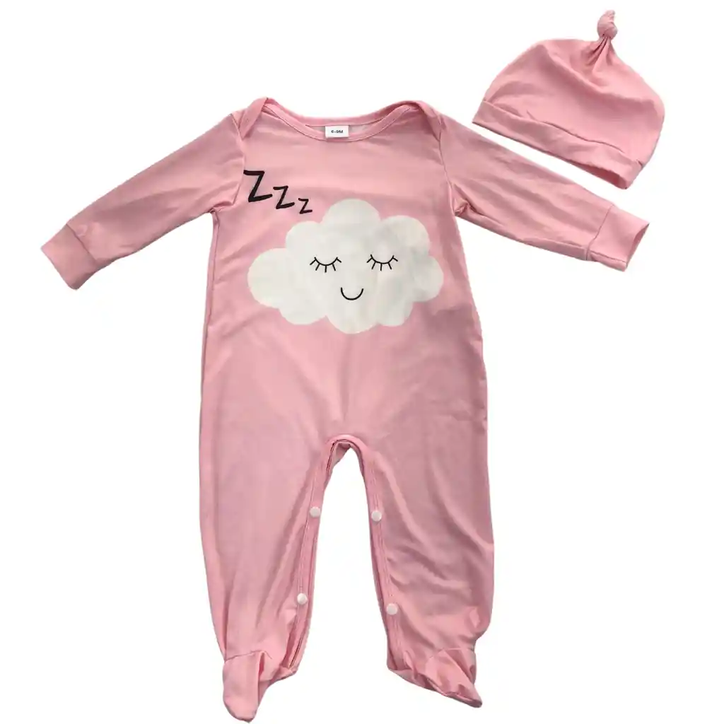 Enterizo para bebé de 6 a 9 meses, confeccionado en tela suave y cómoda, ideal para la piel delicada del bebé. Su diseño en tono rosa con estampado de nube dormilona transmite ternura y calma, perfecto para momentos de descanso y sueño. Incluye gorrito a juego para mayor abrigo y estilo. Cuenta con broches inferiores que facilitan el cambio de pañal y cuello tipo sobre para vestir al bebé con facilidad. Ideal para dormir, uso diario o como regalo especial.