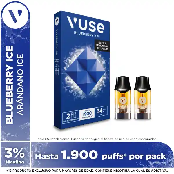 Atención: Este producto no es libre de riesgo, en virtud de sus componentes es nocivo para la salud. Contiene nicotina, sustancia adictiva. Manténgase fuera del alcance de los niños, contiene piezas pequeñas. Antes de consumir, consulte las indicaciones y contraindicaciones de uso. Desde el 21 de julio de 2025 productores e importadores estarán obligados a comercializar sus productos con los pictogramas y advertencias sanitarias establecidas por el Ministerio de Salud. Por lo anterior, coexistirán en los puntos de venta y/o entregas a domicilio empaques de producto con o sin advertencia sanitaria, hasta que estos últimos sean comercializados en su totalidad. La presente comunicación se publica en cumplimiento de lo dispuesto en los artículos 3 (numeral 1.3) y 23 a 28 del Estatuto del Consumidor (Ley 1480 de 2011), suministra información clara, suficiente, veraz y oportuna. El contenido aquí publicado no tiene fines promocionales ni publicitarios.Ingredientes: glicerina vegetal, propilenglicol, saborizante artificial de mora azul, nicotina, ácido benzoico, alcohol bencílico, furaneol, piperonal y damascenona (beta-). Empaque con 2 pods de Vuse. Cont. Net. de cada pod: 2 ml. de líquido vaporizable. Contenido de nicotina por ml de líquido vaporizable: 18 mg/ml, equivalente al 1.6% del contenido neto del pod.
