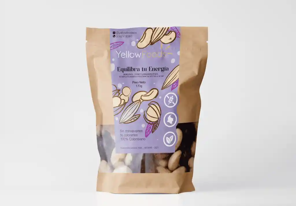 MARAÑON, UCHUVA DESHIDRATADA Y UCHUVA CUBIERTA CON CHOCOLATE 70% CACAO Es un snack fuente de fibra el cual promueve una adecuada digestión. Contiene un excelente aporte de proteína y grasas saludables que favorecen los niveles de saciedad. Podría tener un efecto positivo en las hormonas que permiten tener un estado de ánimo tranquilo y relajado. Puede favorecer el funcionamiento muscular. Tiene un contenido importante de fósforo, hierro, potasio, zinc y ácidos grasos monoinsaturados. Aliado para ejercicio de corta duración y alta intensidad Recomendado como snack de media tarde.