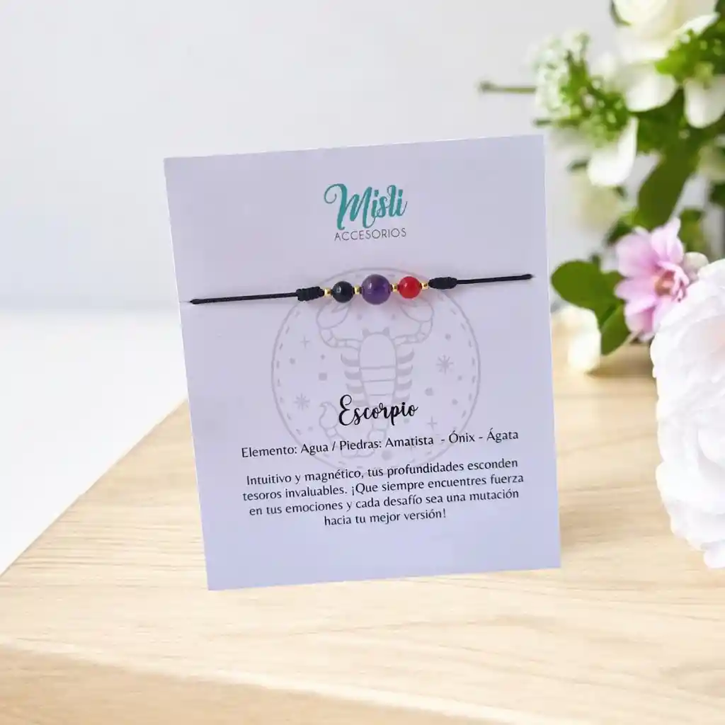 Conéctate con la energía de tu signo zodiacal Lleva contigo la fuerza de los astros con nuestra pulsera zodiacal con piedras naturales. Cada una está cuidadosamente diseñada con piedras auténticas que potencian las cualidades de tu signo, brindándote protección, equilibrio y armonía. Características: - Hecha con piedras naturales seleccionadas según tu signo: ESCORPIO: Amatista - Onix - Ágata. - Energía alineada con tu elemento zodiacal (agua, fuego, tierra o aire) - Diseño exclusivo y ajustable para mayor comodidad Ya sea que busques fortaleza, serenidad o una conexión más profunda con el universo, este accesorio será tu amuleto ideal. Elige la tuya hoy y deja que el poder de los astros ilumine tu camino. Si deseas un color de hilo diferente al de la publicación, indícanos por mensaje una vez realices tu compra. Estamos atentos a responder cualquier duda o información adicional que necesites, con gusto te atenderemos!!