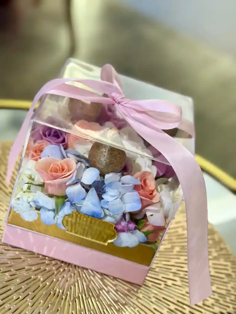 Una creación floral exclusiva que fusiona flores premium en un diseño artesanal lleno de frescura, romanticismo y distinción. DESCRIPCIÓN Reúne un mix de flores en tonos rosas, lilas y azules cuidadosamente dispuestos en un diseño artesanal de lujo que irradia frescura, romanticismo y distinción, ideal para sorprender en los momentos más especiales. INCLUYE - Tarjeta personalizada sin costo adicional. - 3 fresas cubiertas en chocolate.