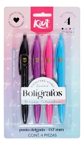 ¡Ahora tus notas tendrán el mejor estilo! Los nuevos bolígrafos Kiut te ofrecen trazos suaves, delicados y continuos. Son retractiles y prácticos para usar. Tienen punta de 0,7 mm para una escritura delicada. Su diseño es super lindo y trae frases inspiradoras. Su cuerpo con textura soft touch es muy suave y fácil de sujetar para mayor comodidad en los trazos." BLISTER BOLIGRAFOS KIUT COLORES X4 UND .