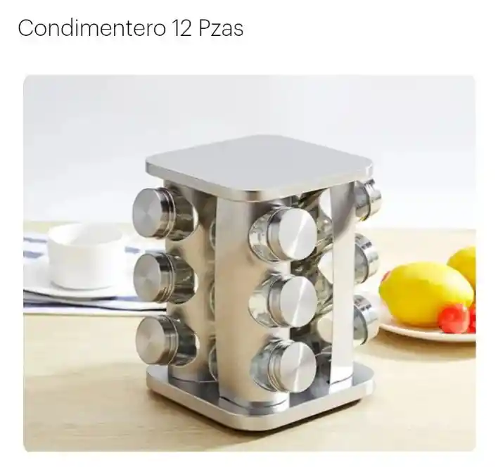 "Mantiene tus especias organizadas y siempre a la mano. Diseño giratorio que facilita el acceso a todos los frascos. Ahorra espacio en la cocina con su base compacta y elegante. Ideal para hogares, restaurantes o cocinas profesionales. Frascos transparentes que permiten identificar fácilmente el contenido. Agrega un toque moderno y decorativo a tu cocina. Materiales duraderos y fáciles de limpiar. Perfecto para guardar sal, pimienta, orégano, comino y más. Características: Capacidad: 12 frascos de vidrio con tapa metálica. Modo: Giratorio tipo carrusel 360°. Material del soporte: Acero inoxidable o plástico resistente (según modelo). Altura aproximada: 25 a 30 cm. Frascos reutilizables y lavables. Base estable y antideslizante. Diseño compacto y funcional. Uso: Doméstico o profesional."