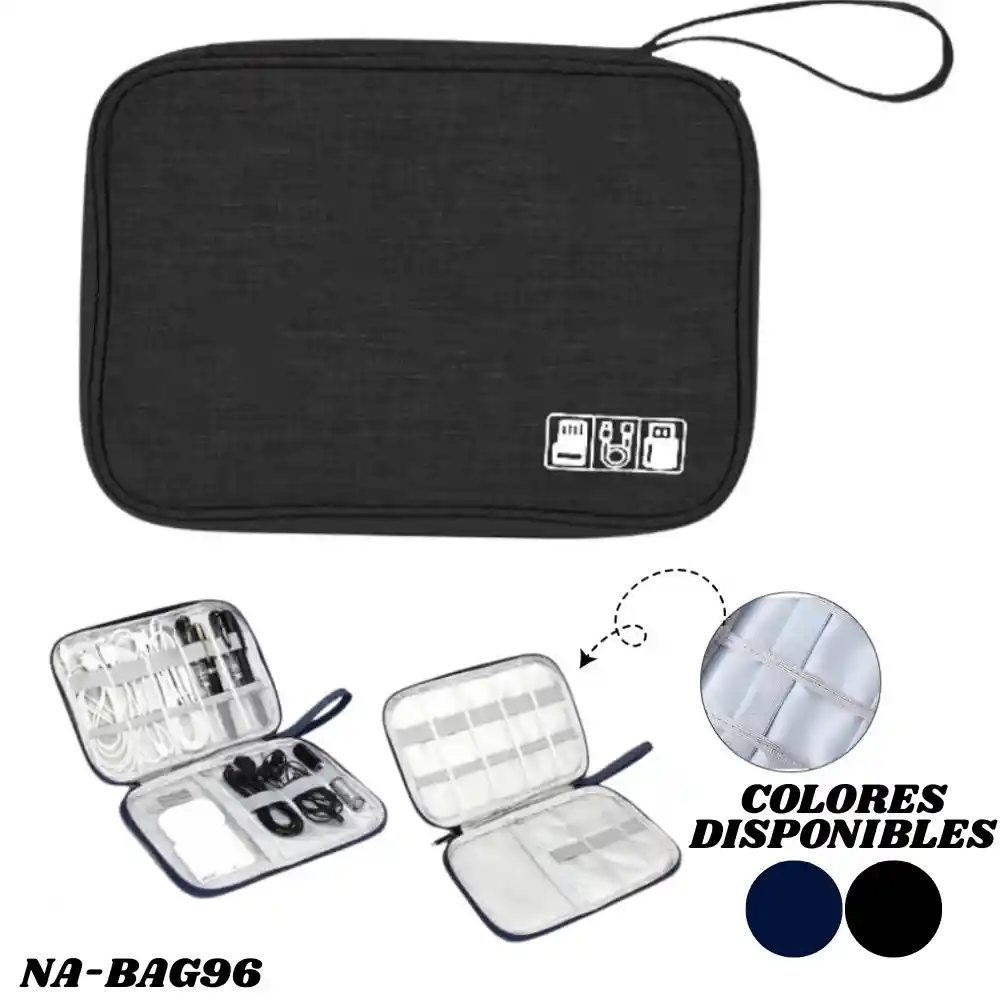Estuche Organizador Funda De Cables Y Accesorios Electronicos NA-BAG96 Mantén tus accesorios electrónicos siempre organizados y al alcance con este práctico estuche de una capa. Ideal para guardar cables, cargadores, power banks, memorias USB, hubs, tarjetas SD, mouse, tabletas, celulares y mucho más. Diseño funcional y compacto: Con bandas elásticas y compartimentos de malla (un bolsillo con cierre de cremallera), este organizador te ayuda a mantener todo en su lugar, evitando enredos o pérdidas. Características: Material resistente y de fácil limpieza Interior acolchado para mayor protección Costuras reforzadas para mayor durabilidad Cierre con cremallera Manija lateral para fácil transporte Dimensiones: 24 cm x 17 cm x 2 cm