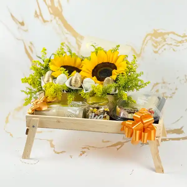 Hay detalles que iluminan el alma tanto como el sol. 🌻 Nuestra bandeja Girasoles & Oro es la combinación perfecta entre la frescura de la naturaleza y el placer del chocolate artesanal. 🍫✨ Contiene Wraps de pollo/maíz con maridaje. Arreglo floral con girasoles vibrantes. Fresas con chocolate (decoradas en tonos blanco y dorado). Frutos secos en frasco de vidrio. Capuccino. Jugo de naranja. Bandeja de madera con patas tipo cama.