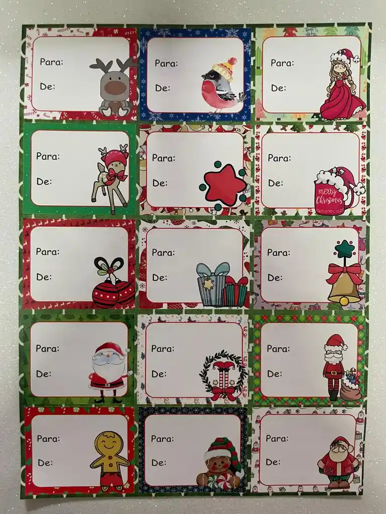 🧑🎄Diseños Encantadores: Variedad de personajes clásicos como Papá Noel, renos, muñecos de nieve, galletas de jengibre y tiernos animales invernales. 🌲Fáciles de Usar: Solo despega y pega. El espacio "Para:" y "De:" es amplio para que escribas con cualquier bolígrafo o marcador sin que se corra la tinta ✨ Impresión a full color con acabados vibrantes que resaltan en cualquier tipo de papel de regalo. 🎁Ideales para regalos familiares, intercambios de oficina, detalles escolares o emprendimientos. 👌Tamaño: 5.5 x 4.5cms 🌟Precio por unidad: $ 5800 cada hoja 📲315 388 0960