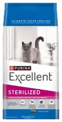 Los gatos castrados, sean adultos o estén en crecimiento necesitan una nutrición especifica. PURINA® EXCELLENT® STERILIZED es un alimento completo y balanceado que ofrece una combinación de ingredientes adecuada para obtener una condición corporal ideal, ayudando en el control de bolas de pelo y manteniendo un tracto urinario saludable. Balance adecuado de ingredientes para un tracto urinario saludable: Una óptima combinación de ingredientes que ayuda a mantener un pH adecuado en la orina, contribuyendo a la reducción de la formación de cálculos y cristales, y al mantenimiento de un tracto urinario saludable. Contribuye a una condición corporal ideal: Con fuentes de proteínas de elevada digestibilidad que garantizan el aporte de aminoácidos esenciales, ayudando a mantener músculos fuertes y sanos. Favorece el control de bolas de pelo: Con probiótico natural y fibras naturales que ayudan a eliminar las bolas de pelo producidas al lamerse.