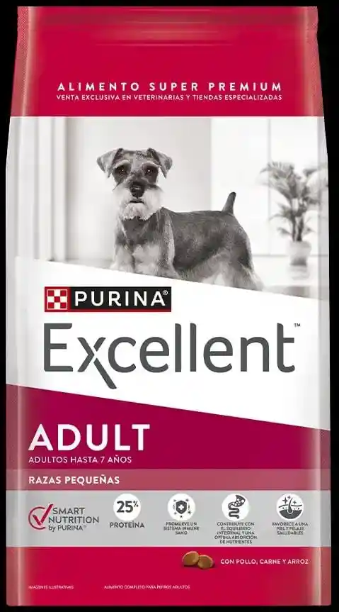 le ofrece a tu perro una nutrición que lo mantenga sano y activo. Con proteínas de alta calidad y antioxidantes como la vitamina E y selenio, que contribuyen a fortalecer las defensas y a mantener un sistema inmune saludable. Con el sistema SMART NUTRITION BY PURINA®, que aporta múltiples beneficios científicamente comprobados, que mantienen a tu perro adulto con un excelente estado de salud. Promueve un sistema inmune sano Con antioxidantes y proteína de alta digestibilidad que contribuyen a fortalecer las defensas y a mantener un sistema inmune saludable. Favorece a una piel y pelaje saludables La combinación de los ácidos grasos Omega 6 y 3 junto a vitaminas y minerales favorecen una piel y pelaje saludables. Contribuye con el equilibrio intestinal y una óptima absorción de nutrientes La inclusión del prebiótico natural ayuda a optimizar el equilibrio intestinal. Fórmula que colabora con una buena salud digestiva y una óptima absorción de nutrientes. Con zeolita (fuente mineral) y fibra natural que ayudan a producir heces firmes. Colabora con la salud oral Croqueta que ayuda a evitar la acumulación del sarro. Tamaño de croquetas adecuadas para perros de raza pequeña