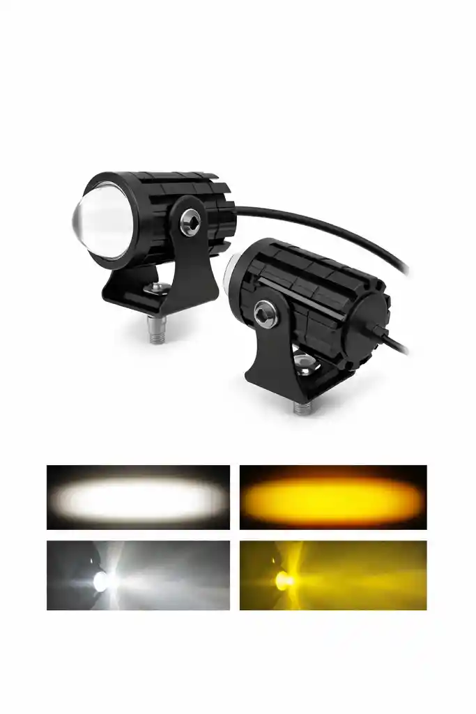 Cuerpo en plástico resistente con base metálica. Se instalan en soporte universal (no incluye tornillo) y cuentan con luz LED blanca y amarilla de doble intensidad. Incorporan lente tipo lupa para mayor enfoque y visibilidad en condiciones de lluvia o neblina.