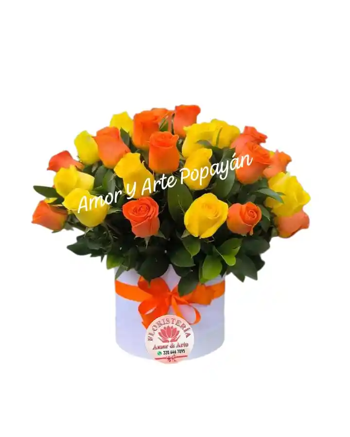 Sembrado en base con mix de rosas amarillas y naranjas que irradian alegría como el amanecer. Incluye: moño, tarjea con mensaje personalizado, aroma, brillo.