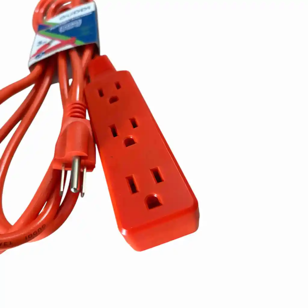 La extensión eléctrica Guddi es un cable naranja de 3 metros de largo, diseñado para uso en interiores. Cuenta con tres tomas de corriente y especificaciones de 13 amperios, 125 voltios de CA y una potencia máxima de 1625 vatios, utilizando un calibre de cable 16 AWG.