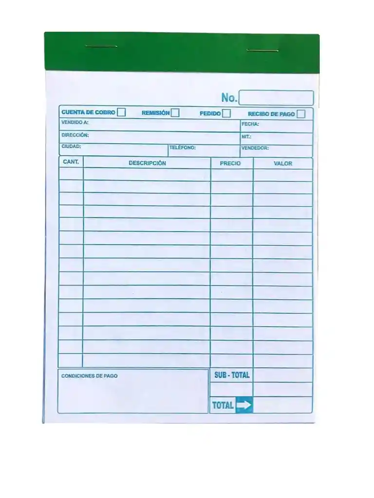 SOLO QUEDA 1 UNIDAD DISPONIBLE DE ESTE PRODUCTO Autocopiante. Tamaño 1/16. Medidas 23 x 16 cm. 20 juegos: Original y hoja autocopiante. No necesita papel carbón. Multifuncional, puede usarlo como Cuenta de cobro, Pedido, Cotización, Remisión