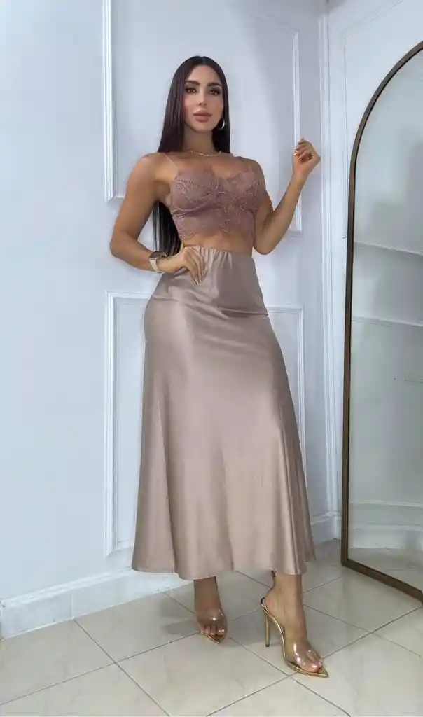 Nuestra Falda Satinada en tono camel es la definición de elegancia sin esfuerzo. Confeccionada en licra espejo, esta prenda combina el lujo visual del satín con la comodidad y ajuste perfecto de la licra, logrando un acabado brillante que captura la luz en cada movimiento. ¿Por qué te encantará? Efecto Espejo: Su acabado satinado premium aporta un brillo sofisticado, ideal para eventos de noche o para elevar un look casual de día. Ajuste Elástico: Al ser licra de alta calidad, se adapta suavemente a tus curvas sin apretar, garantizando comodidad total durante todo el día. Versatilidad Total: Su diseño de tiro alto y corte fluido la hace perfecta para combinar con un crop top de encaje (como en la foto), una camisa básica o incluso un sweater oversized.