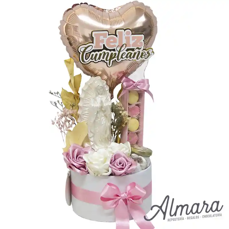 Caja Guadalupe: Fe, Amor y Dulzura Cilindro 15 cm Virgen de guadalupe Flores eternas Caja de chocolates y alfajores 1 Vela aromatica en frasco de vidrio Globo con mensaje